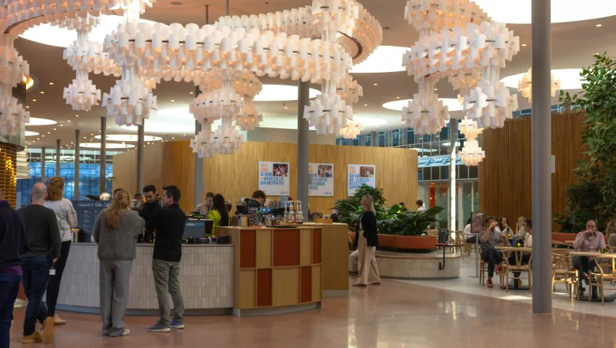 In dit centrale en inspirerende gebied kun je werken, samenwerken, leren en collega’s en gasten ontmoeten. Waar het Cafe voorheen vooral gericht was op snelle 'to-go' service, nodigt het nu uit tot langere verblijven. Een van de meest opvallende veranderingen is het ruime terras, omgeven door weelderig groen.