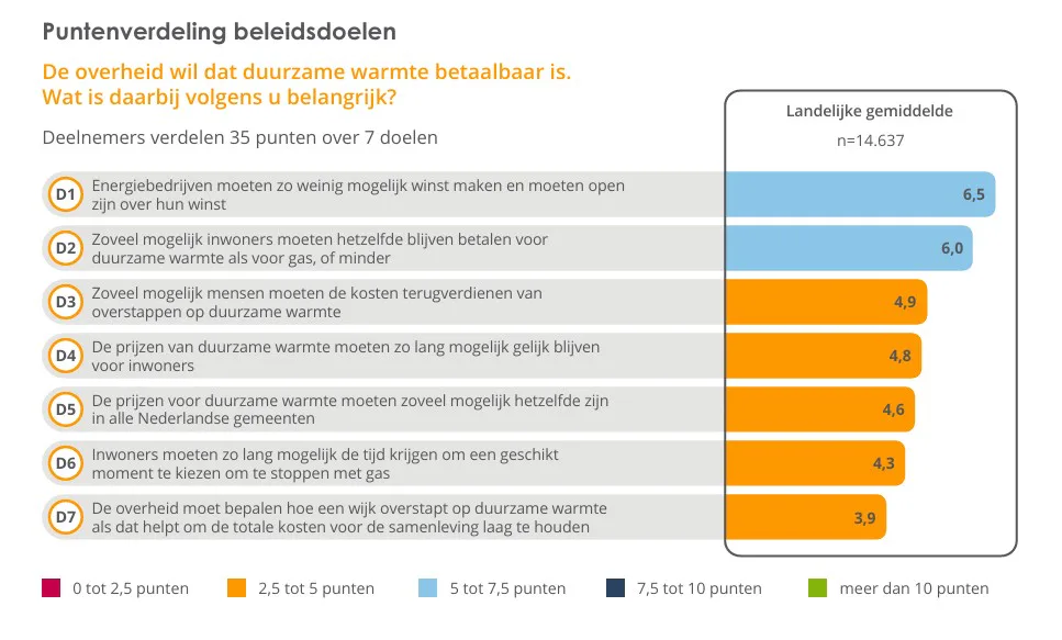 Dat blijkt uit de ordening die deelnemers maakten van zeven ‘doelen’ voor de overheid om op te letten bij het betaalbaar houden van duurzame warmte. Bovenaan zetten deelnemers het doel ‘energiebedrijven moeten zo weinig mogelijk winst maken en moeten open zijn over hun winsten.’ Onderaan eindigde ‘De overheid moet bepalen hoe een wijk overstapt op duurzame warmte als dat helpt om de totale kosten voor de samenleving laag te houden.’